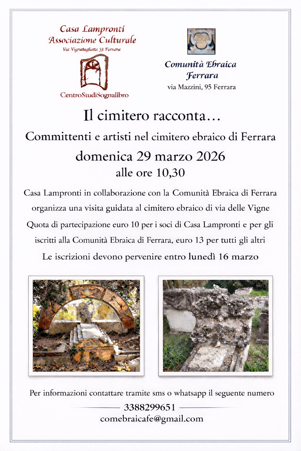 L'iniziativa è organizzata da Casa Lampronti - Associazione Culturale/Centro Studi Sognalibro, in collaborazione con la Comunità ebraica di Ferrara e rappresenta un'occasione preziosa per esplorare non soltanto un luogo di sepoltura, ma un autentico archivio di arte, memoria e identità.