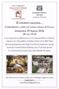 L’iniziativa è organizzata da Casa Lampronti – Associazione Culturale/Centro Studi Sognalibro, in collaborazione con la Comunità ebraica di Ferrara e rappresenta un’occasione preziosa per esplorare non soltanto un luogo di sepoltura, ma un autentico archivio di arte, memoria e identità.