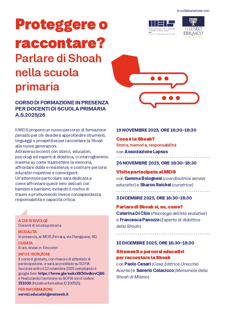 Il MEIS propone il nuovo percorso di formazione “Proteggere o raccontare? Parlare di Shoah nella scuola primaria” indirizzato ai docenti della scuola primaria e che si svolgerà in presenza al MEIS (via Piangipane 81, Ferrara).